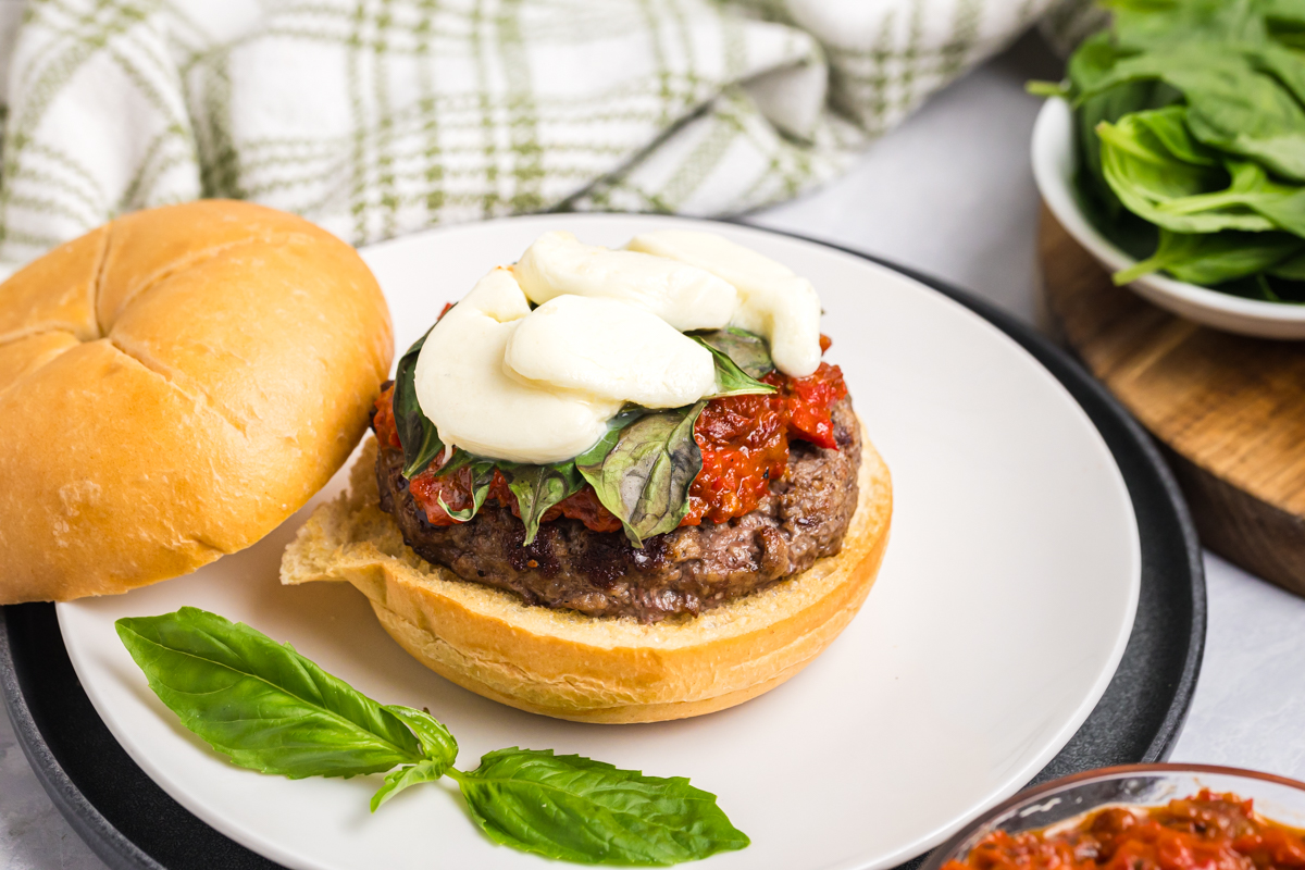 Caprese burger with fresh mozzarella, basil, and sun-dried tomato spread on a toasted bun