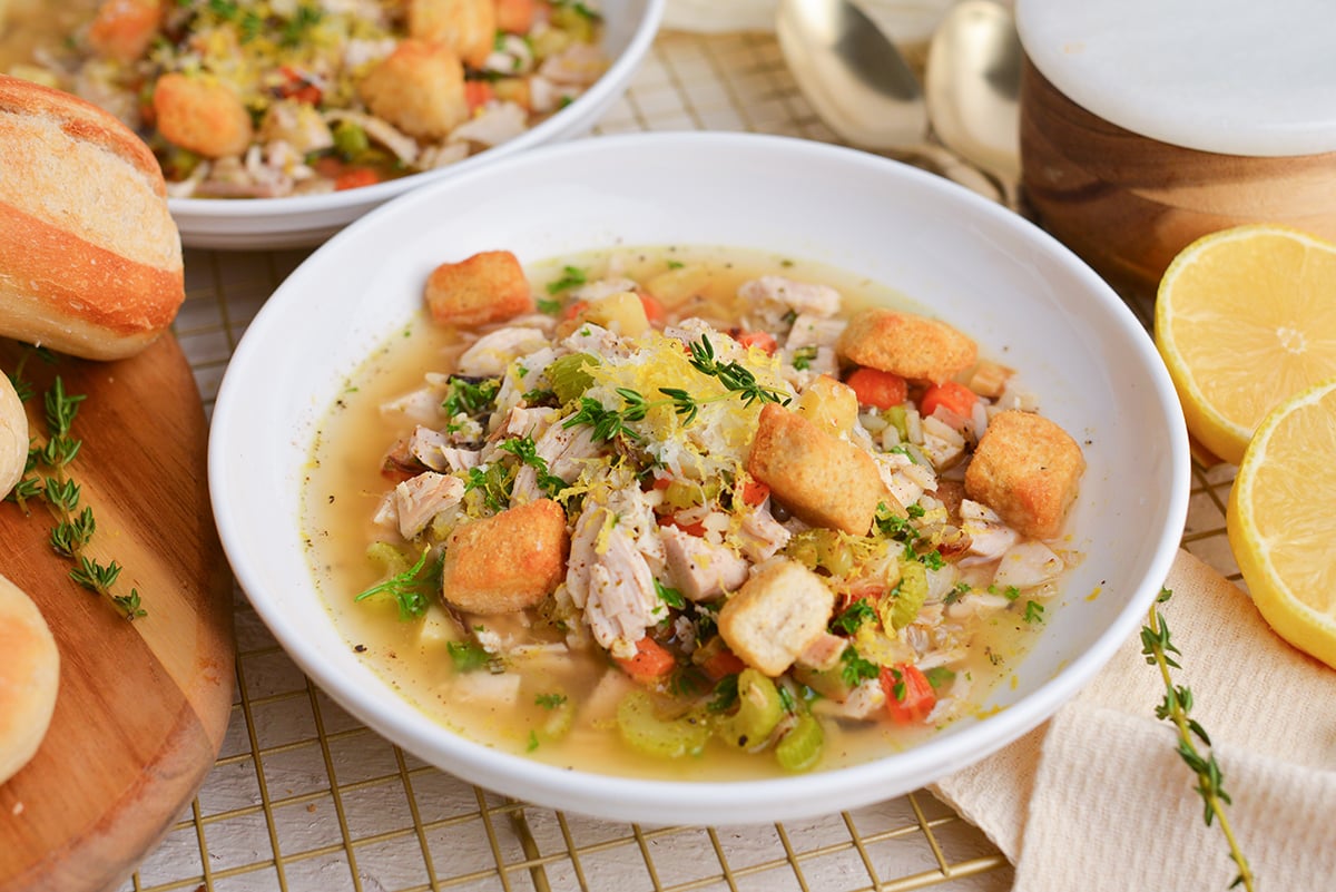 Bowl of quick chicken and wild rice soup with lemon zest, Parmesan, and croutons on a cozy linen.