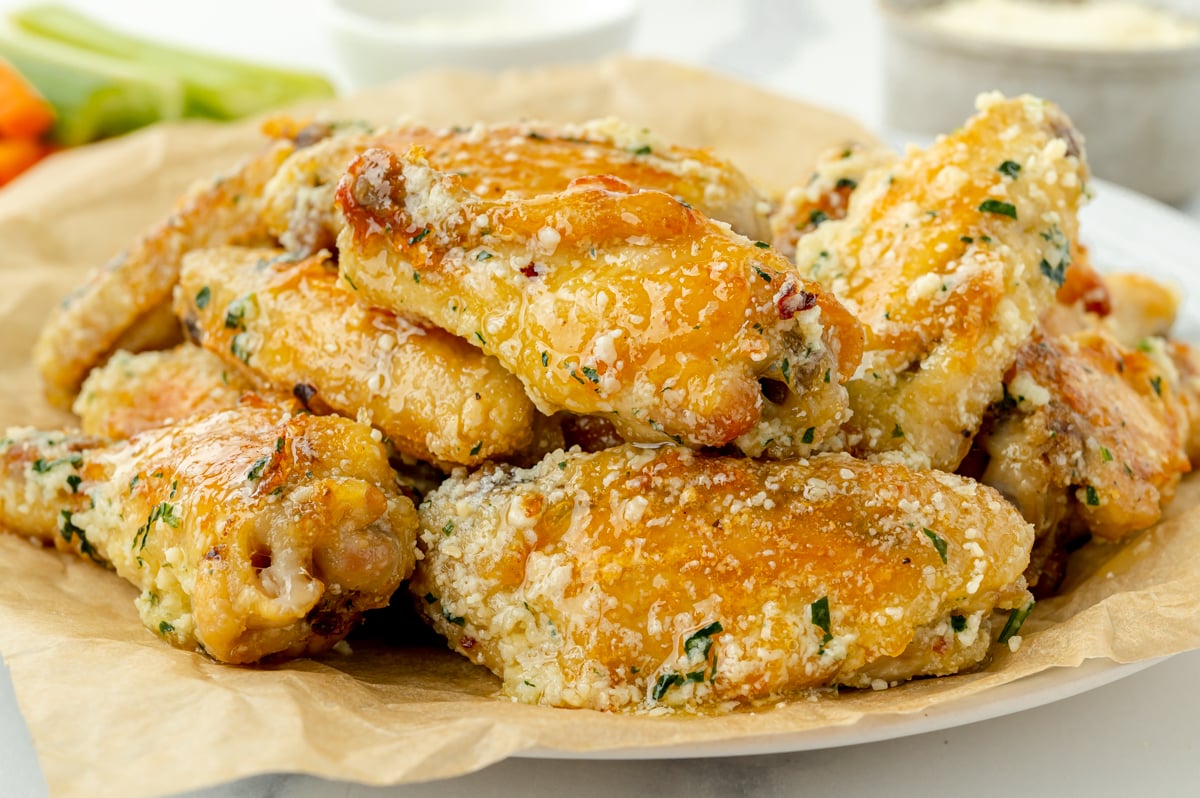 straight on shot of plate of garlic parm wings