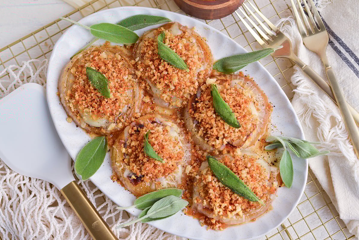 - Remove and evenly divide the toasted panko on the onions and finish off with a piece of fried sage.