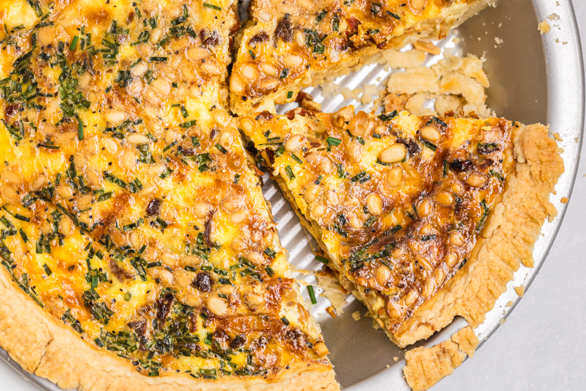 Make a silky goat cheese quiche with chives, sun-dried tomatoes and pine nuts. Blind-baked crust, creamy custard.