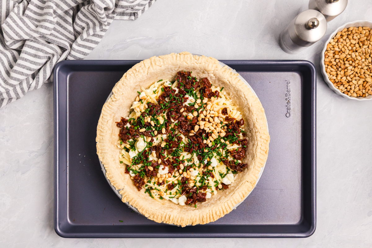 3. Layer fillings in the cooled crust with the goat cheese, Gruyère, chives, sundried tomatoes and pine nuts.