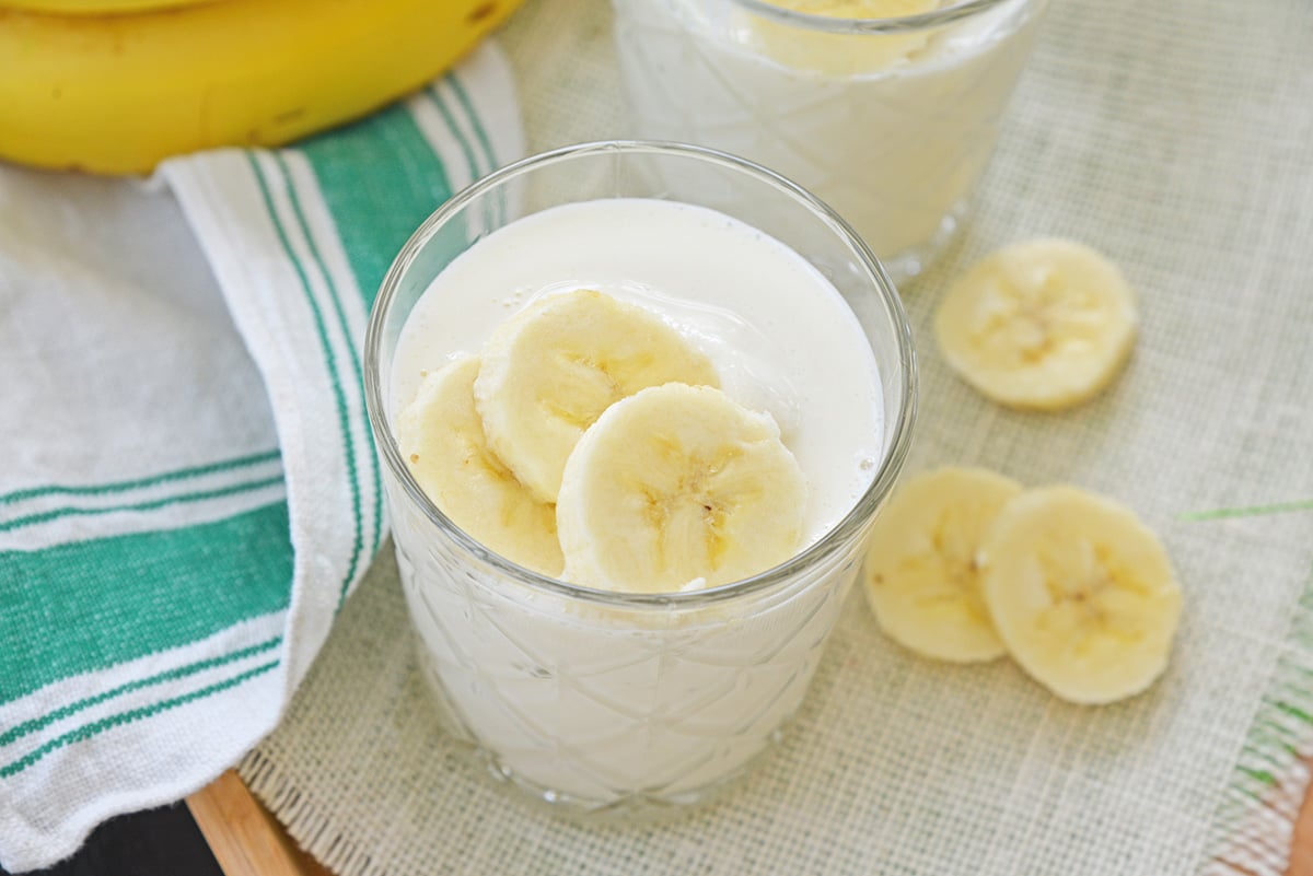 angled overhead of banana smoothie in a glass