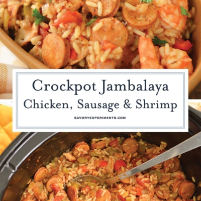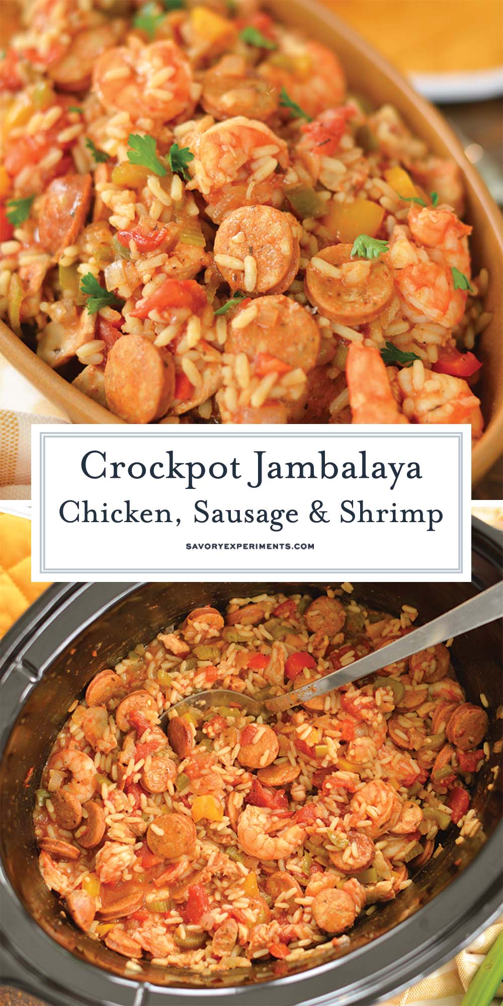 Keyword: chicken jambalaya, chicken sausage shrimp jambalaya, Creole jambalaya, crockpot chicken jambalaya, easy slow cooker dinner, slow cooker jambalaya