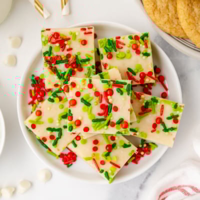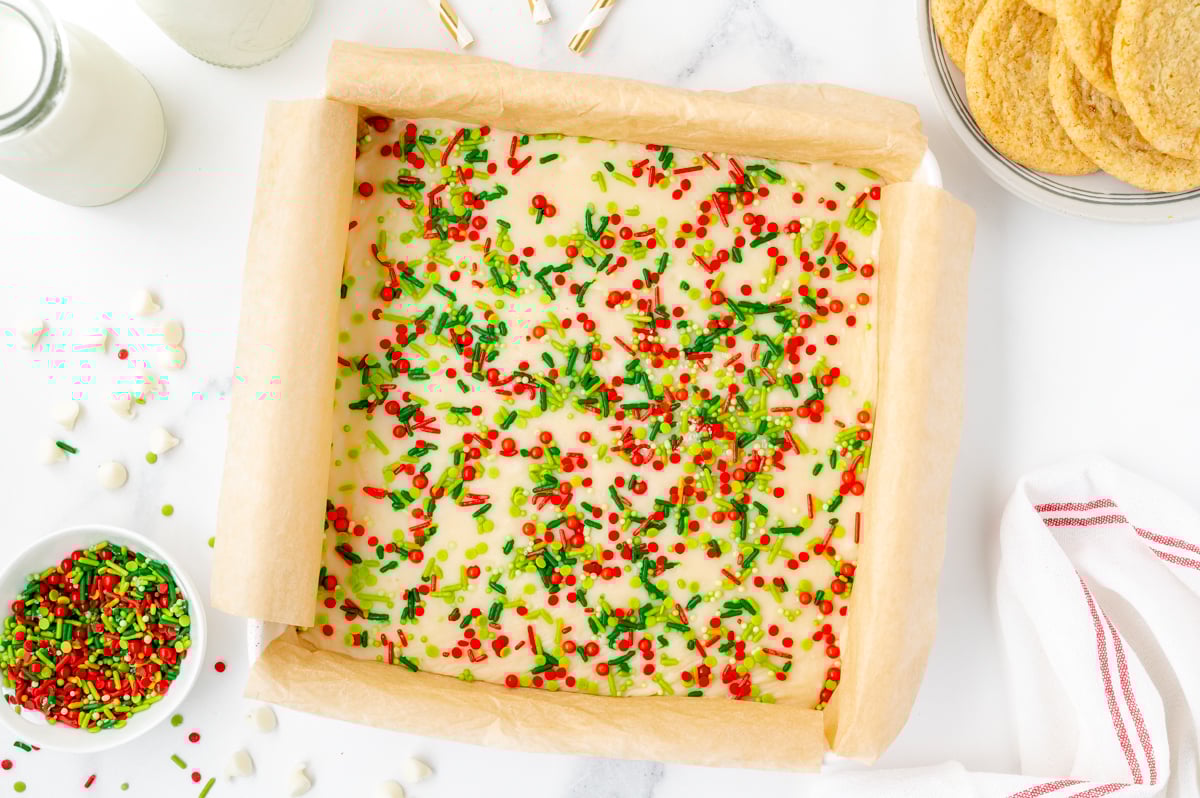 - Quickly pour the mixture into the prepared baking pan and tap to even it out. Top with your desired 1-2 tablespoons festive holiday sprinkles.