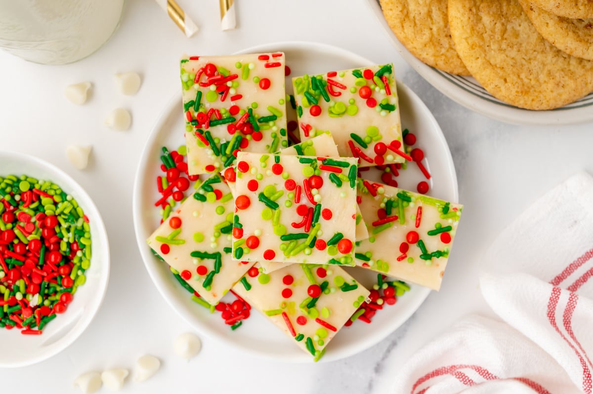 - Chocolate Drizzle: Melt a small amount of colored chocolate melts to add extra festive fun and color to your fudge; drizzle after chilling.