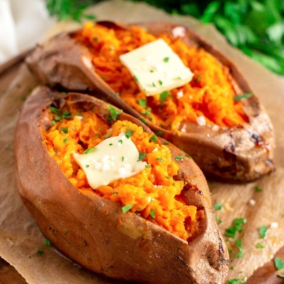 A quick and easy side dish for fall, these baked sweet potatoes are coated in olive oil, seasoned with salt and pepper, and served with a dollop of butter.