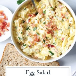 This egg salad with bacon is creamy, flavorful and packed with texture from crispy bacon, fresh herbs and bright lemon. It’s a simple twist on classic egg salad that turns an everyday sandwich filling into something extra satisfying.